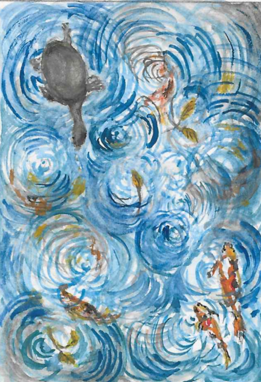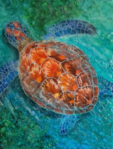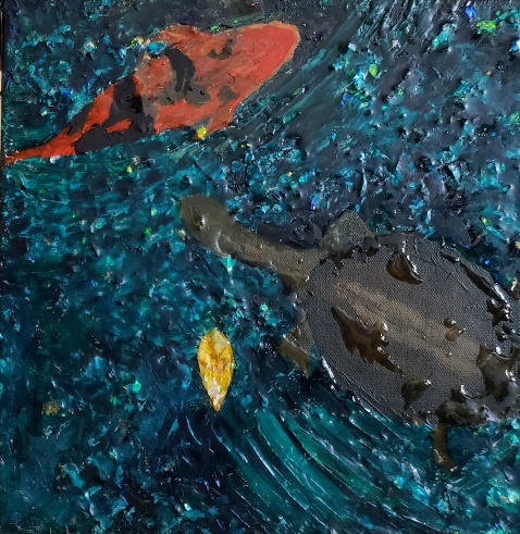 "No Place for a turtle #2 - 12x12 Mixed media acrylic. Inspired by the insistant turtle at the bridge at Ringling estate.